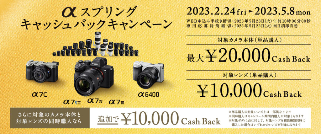 α7RⅤは50,000円、α7Ⅳは¥30,000のキャッシュバックを受けられるので大変お得です。